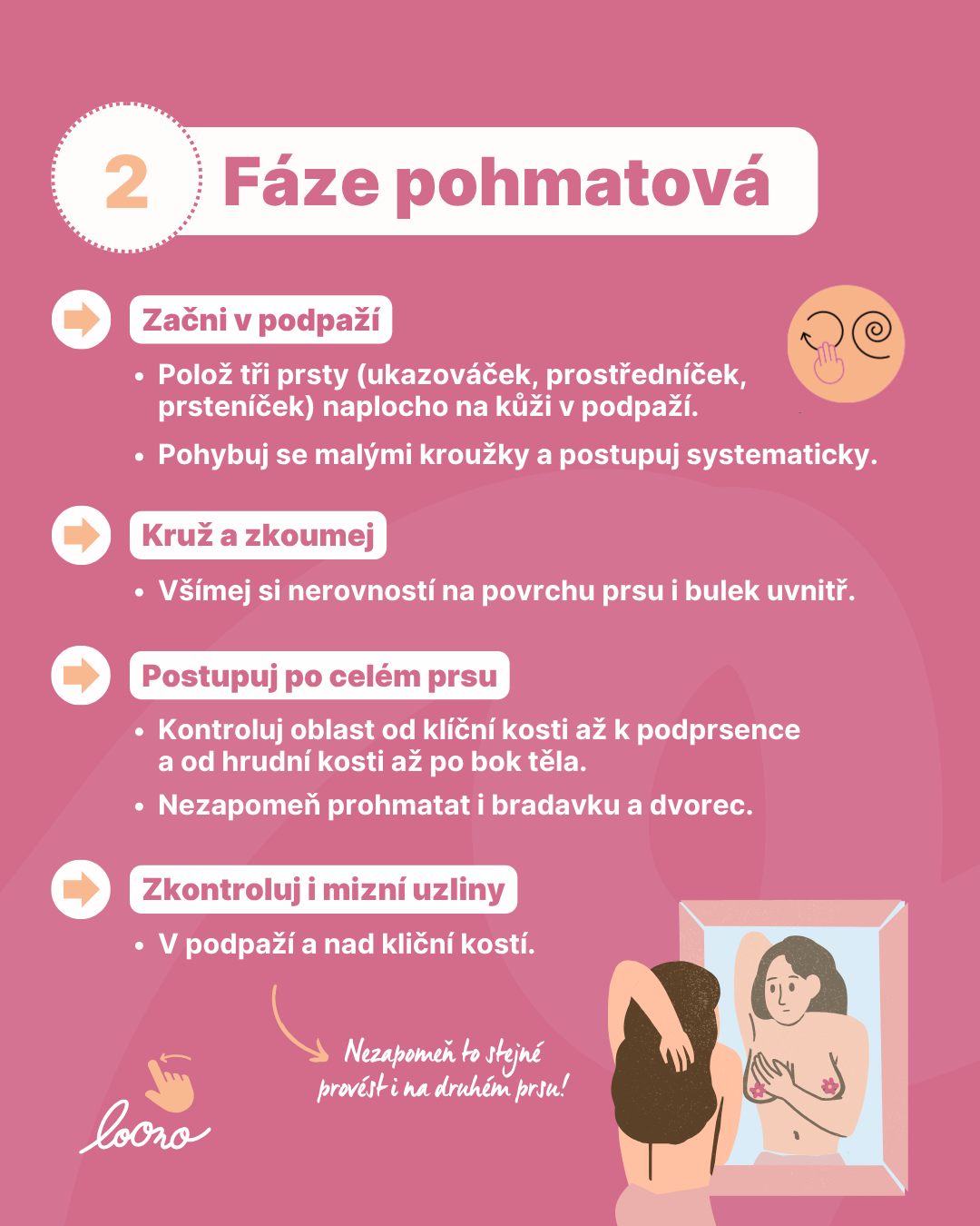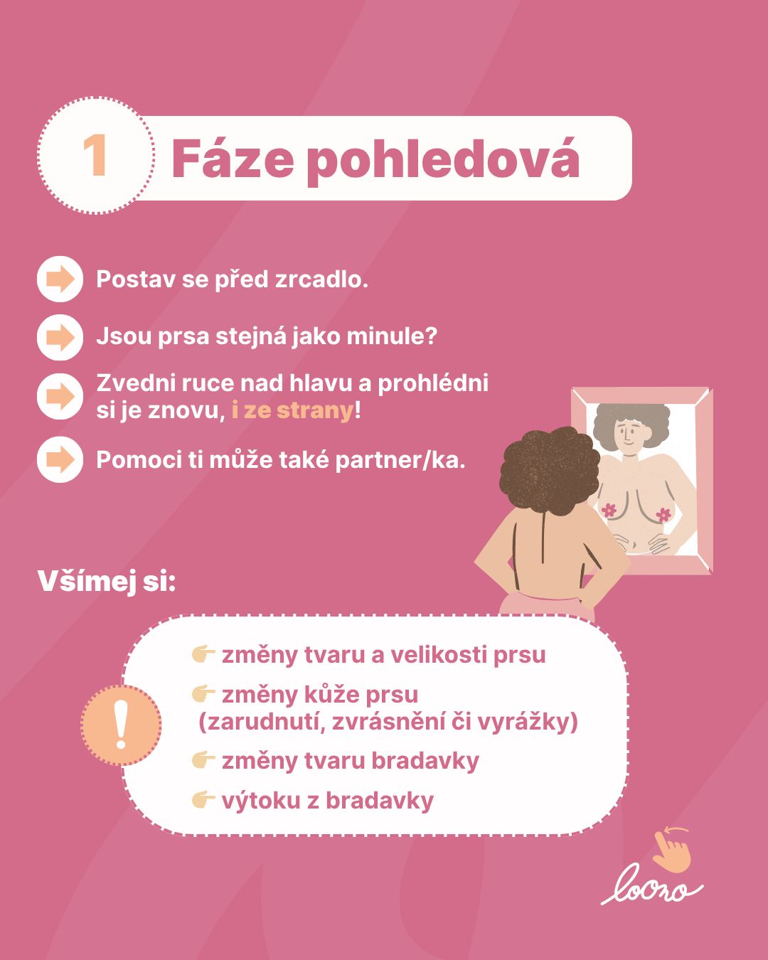 K zachycení těchto příznaků slouží samovyšetřování. Jak si vyšetřit prsa je jednoduché se naučit, podívejte se na návod.
